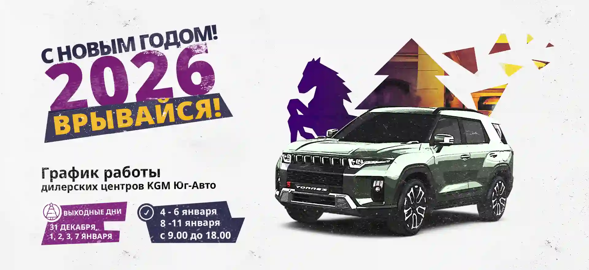 Ниже — график работы дилерских центров KGM в новогодние праздники: